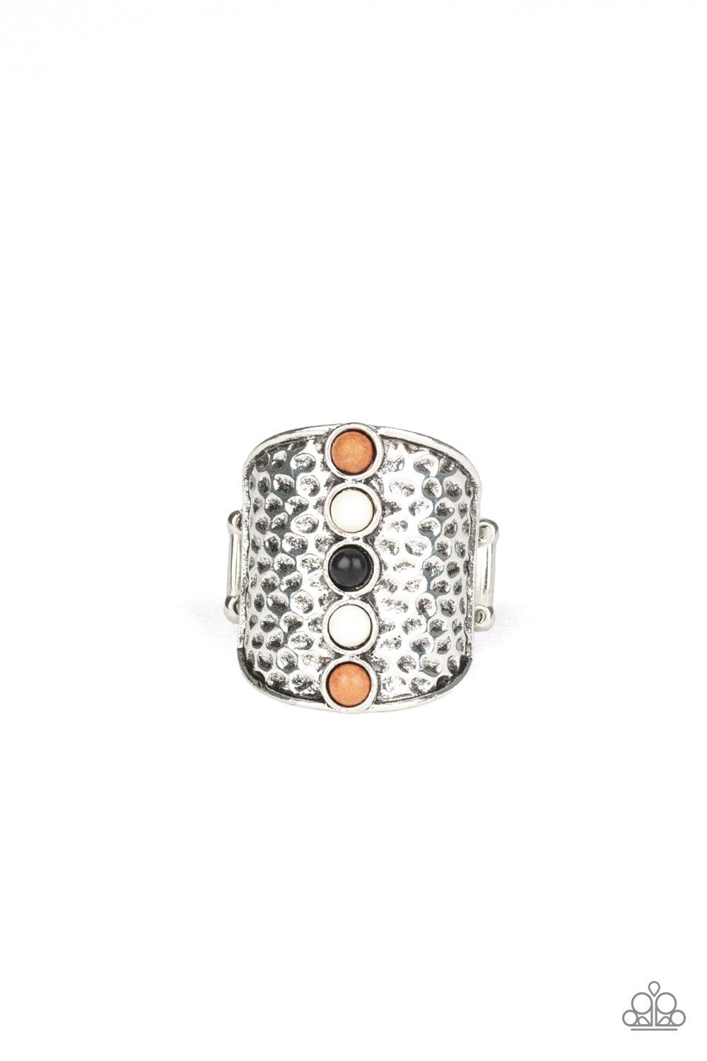 A row of dainty brown, black, and white stones are stacked vertically down the center of a hammered silver frame for a seasonal flair. Features a stretchy band for a flexible fit.