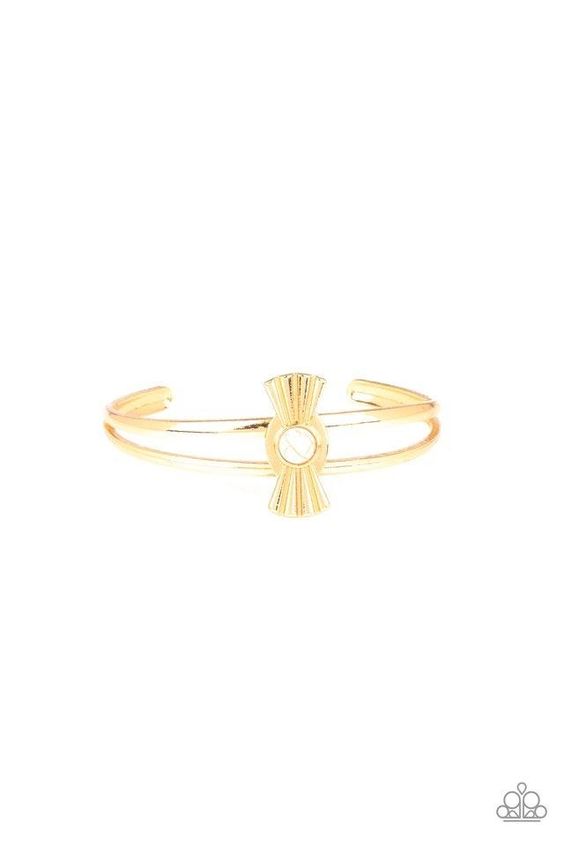 Dotted with a dainty white stone center, a gold frame flares from atop the center of a dainty gold cuff for a seasonal fashion.