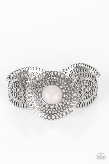 Featuring lace-like patterns, stenciled silver frames connect across the wrist in a whimsical fashion. A neutral gray bead is pressed into the round center frame for a colorful seasonal finish. Features an adjustable clasp closure.