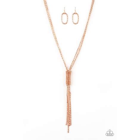 Shimmery strands of shiny copper popcorn chain dramatically fall down the chest. An additional chain wraps around the cascading strands, creating a bold central pendant with shimmering tassels.