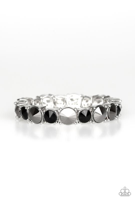 An assortment of oversized black and hematite rhinestones are pressed into sleek square frames and threaded along stretchy bands, creating a blinding sparkle around the wrist.