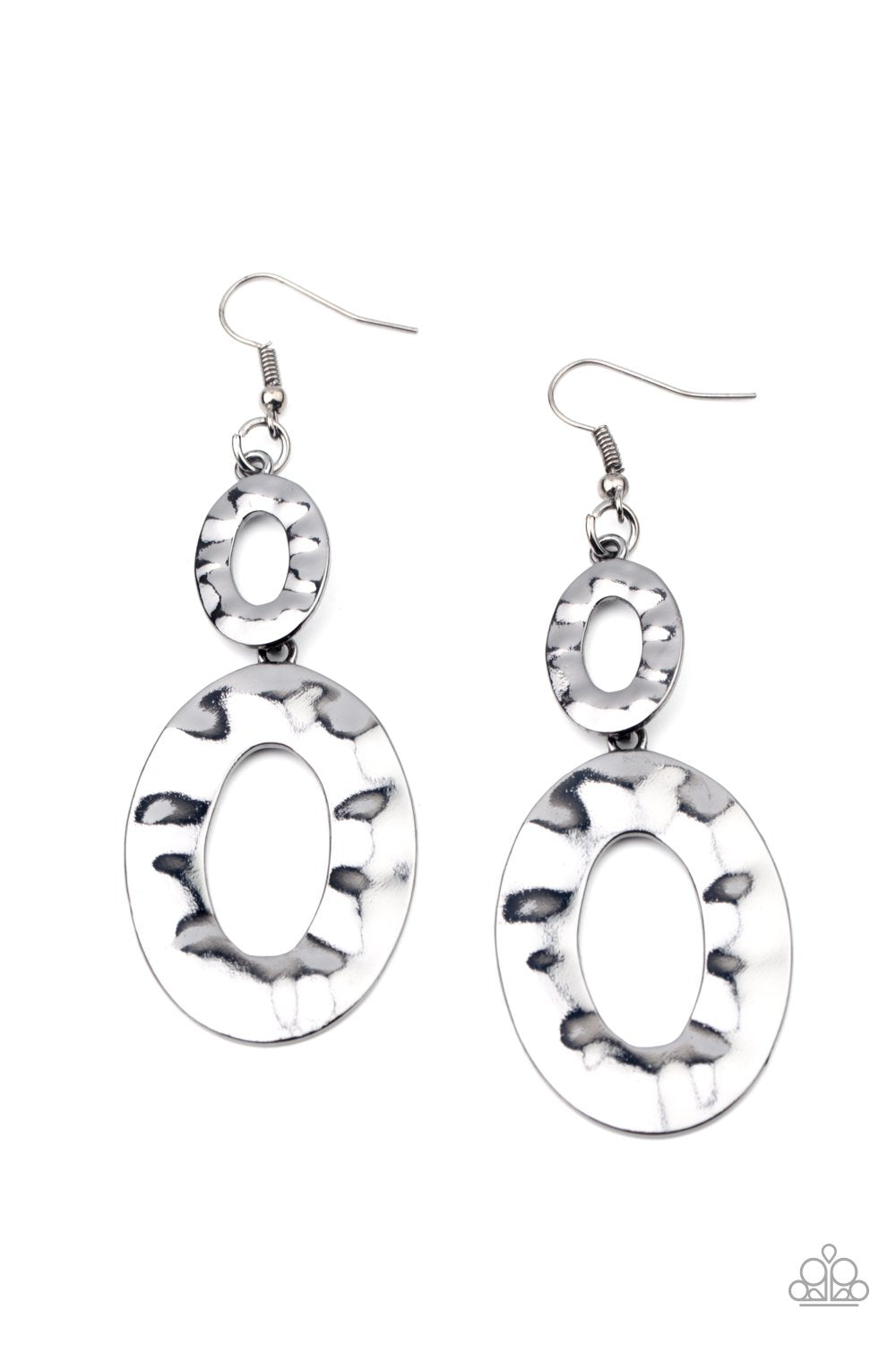 A mismatched pair of hammered gunmetal ovals delicately link into a blinding metallic lure. Earring attaches to a standard fishhook fitting.