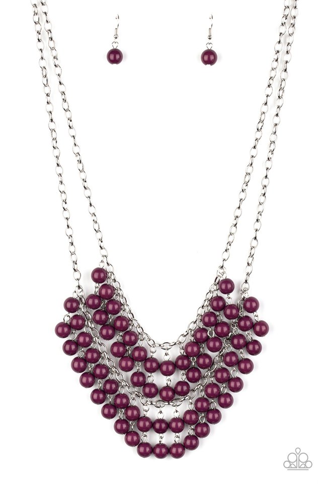 Pairs of plum beads cascade from the bottoms of two silver chains, creating a vivaciously layered fringe below the collar. Features an adjustable clasp closure.
