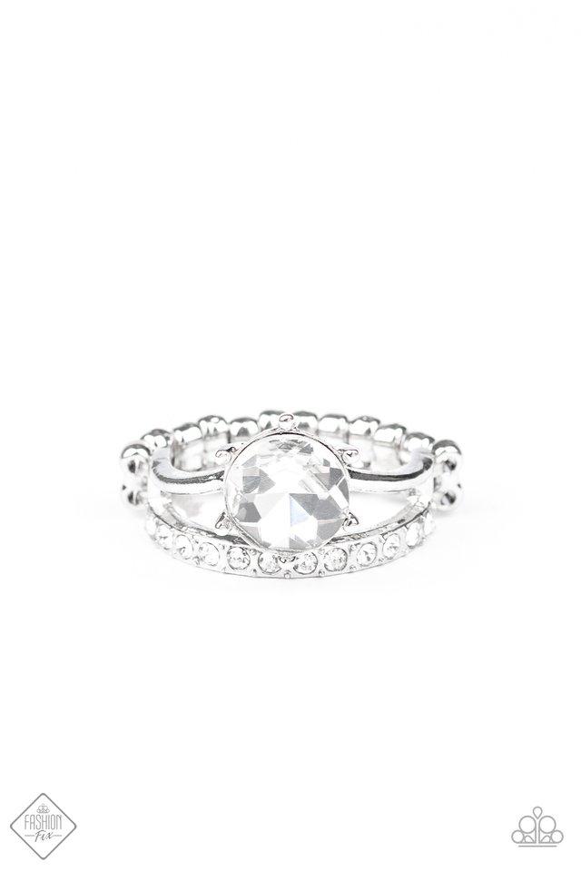 An oversized white rhinestone dots the center of a dainty silver band, as a second band lined with glittery white rhinestones runs parallel, resulting in a glamorously stacked look. Features a dainty stretchy band for a flexible fit.