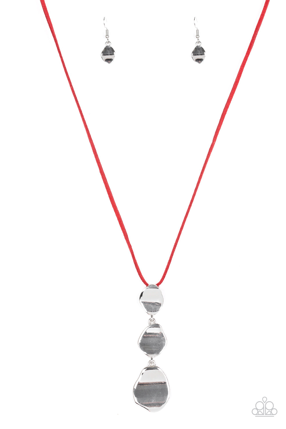 Delicately hammered in a glistening shimmer, asymmetrical silver frames link at the bottom of a lengthened red suede strand for a bold artisanal look. Features an adjustable clasp closure.