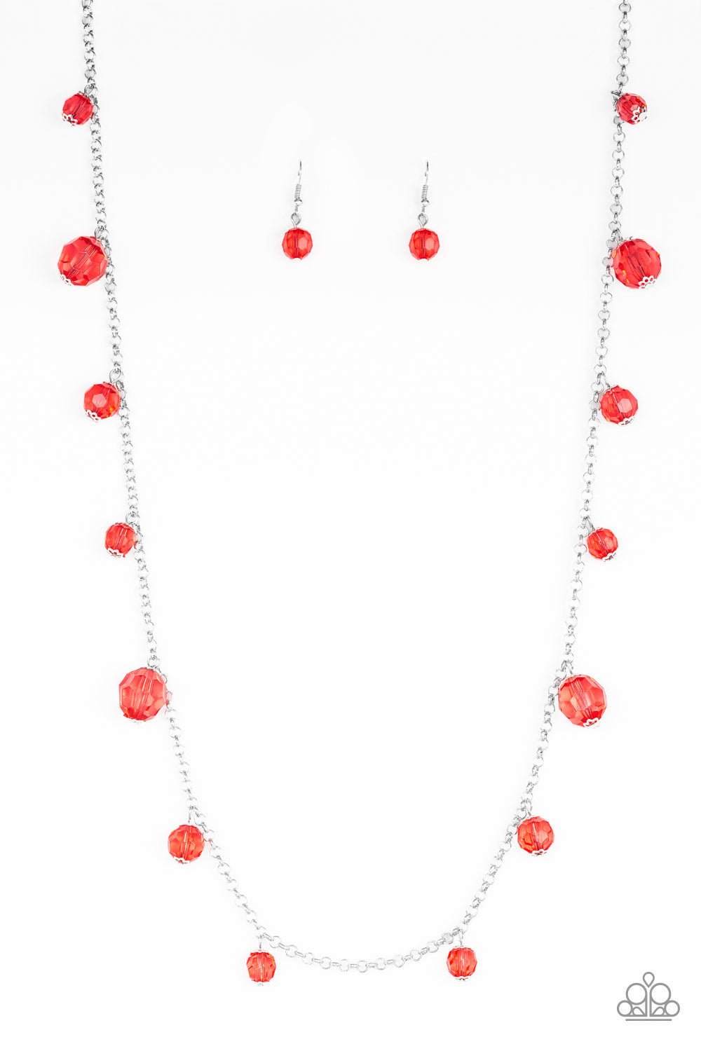 Varying in size, a collection of glassy red crystal-like beads trickle down a shimmery silver chain across the chest for a whimsical look. Features an adjustable clasp closure.