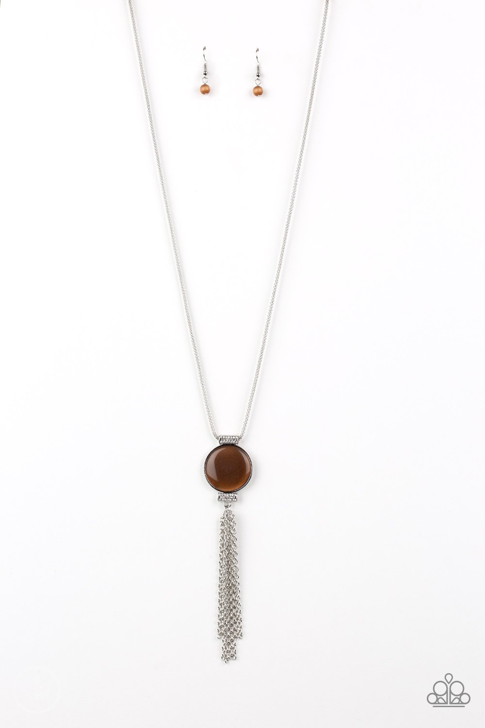 Infused with white rhinestone encrusted fittings, a glowing brown cat's eye stone pendant swings from the bottom of a rounded silver mesh chain for a whimsical look. Features an adjustable clasp closure.
