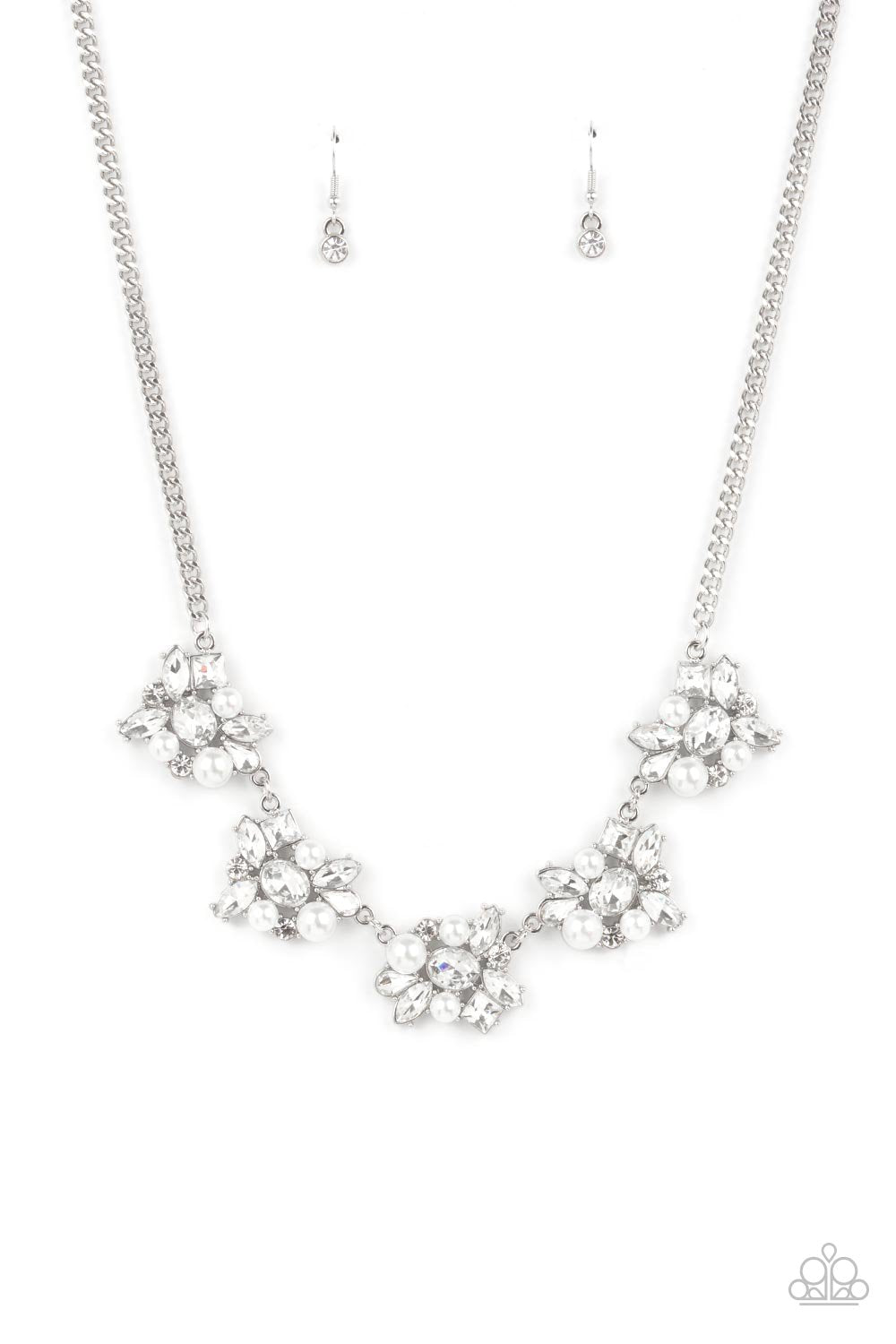 Bubbly white pearls and regally cut white rhinestones coalesce into blinding frames that glamorous link below the collar, creating a timeless fringe. Features an adjustable clasp closure.