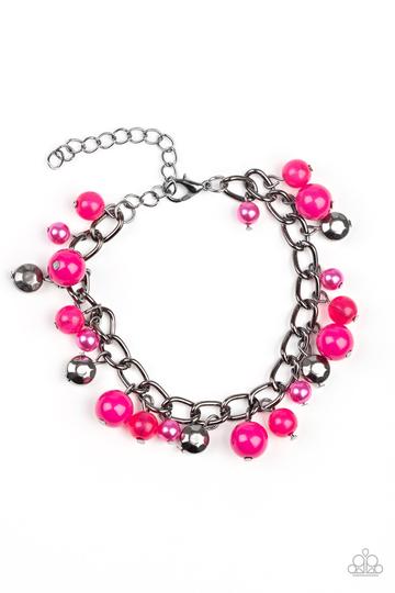 Pearly and polished pink beading joins faceted gunmetal beads along a bold gunmetal chain, creating a sassy fringe around the wrist. Features an adjustable clasp closure.