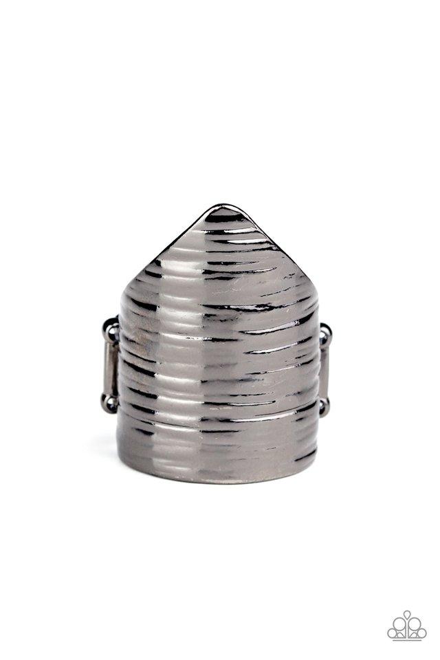 Engraved in linear textures, and abstract triangular gunmetal frame folds around the finger for a bold look. Features a stretchy band for a flexible fit.