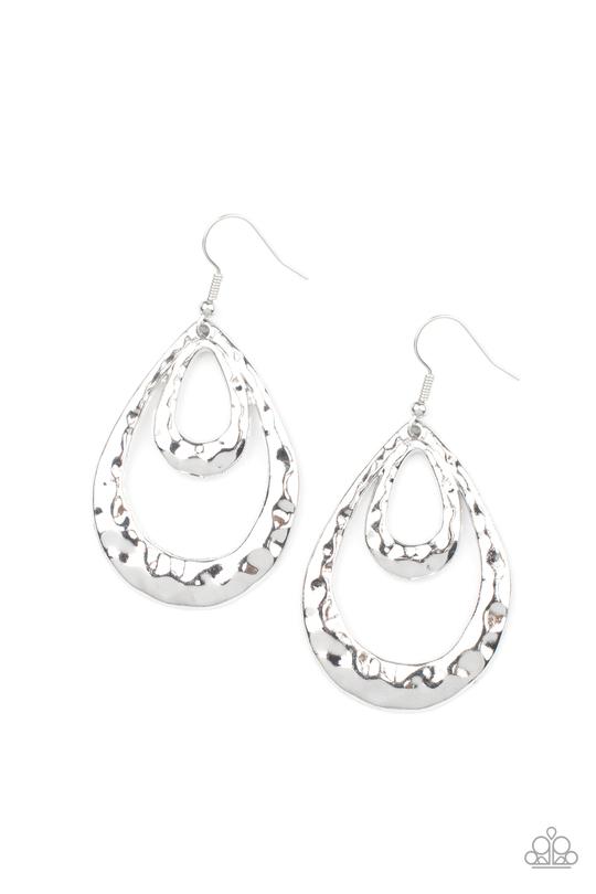 Hammered silver teardrops join into an edgy layered lure, creating an intense industrial display. Earring attaches to a standard fishhook fitting.