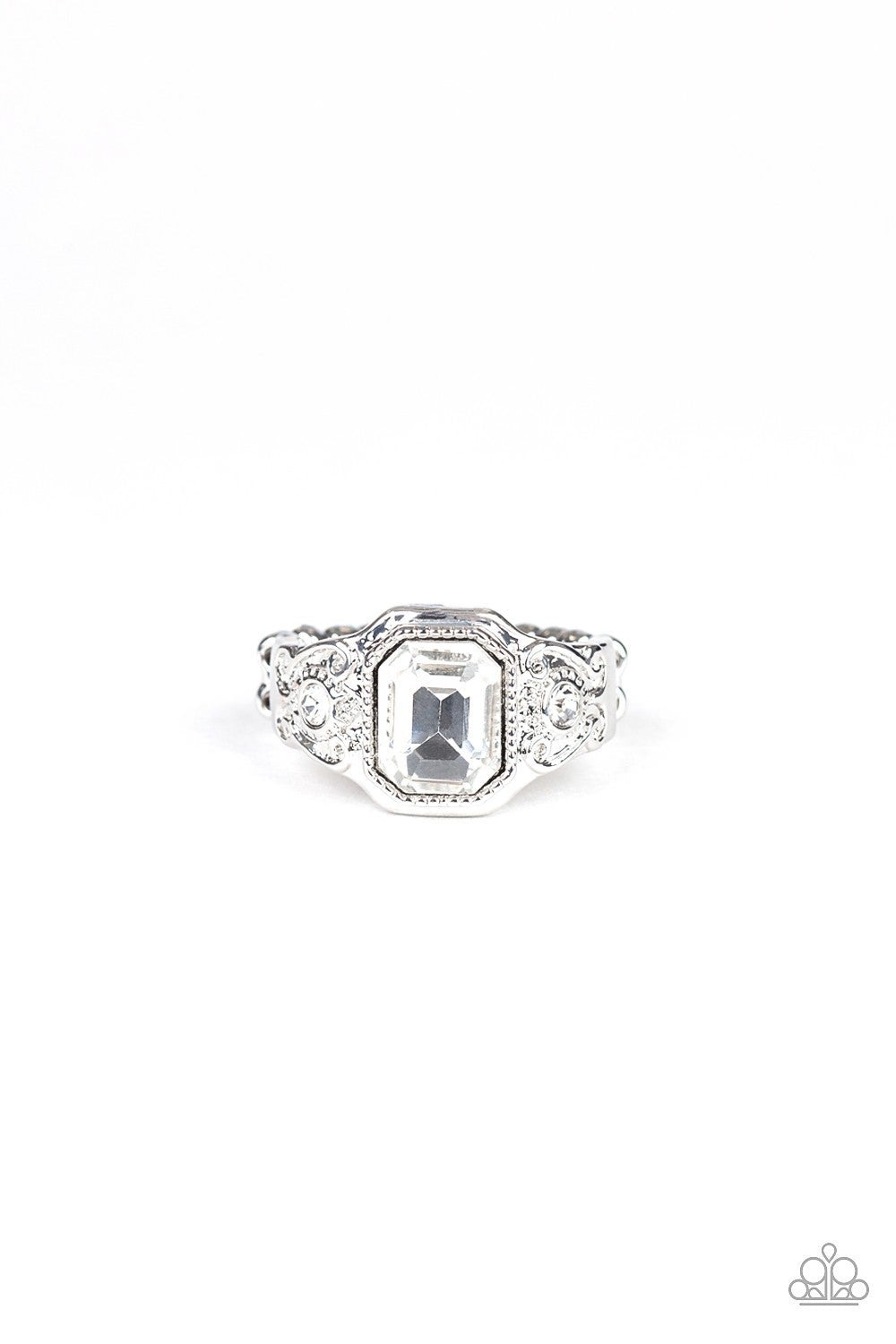 Featuring a regal cut, a faceted white rhinestone is pressed into the center of a dainty silver band swirling with refined filigree and glassy white rhinestones. Features a dainty stretchy band for a flexible fit.