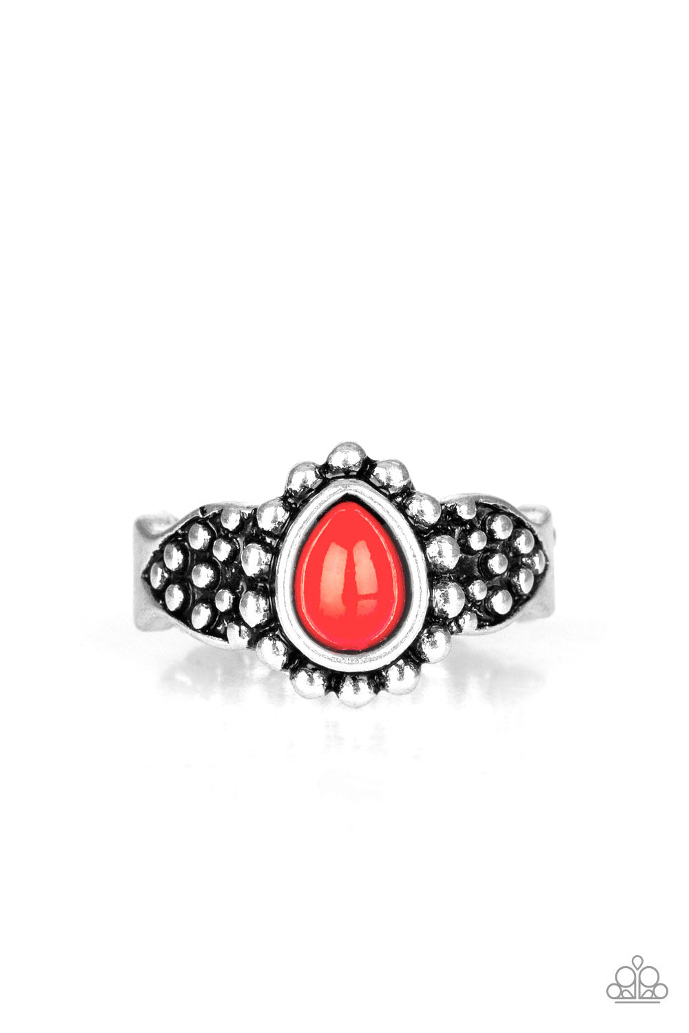 A teardrop red bead is pressed into the center of a dainty silver band radiating with studded patterns for a seasonal look. Features a dainty stretchy band for a flexible fit.