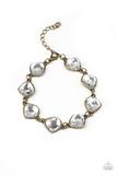 Featuring antiqued brass frames, imperfect glassy white gems link around the wrist for a glamorous vintage inspired look. Features an adjustable clasp closure.