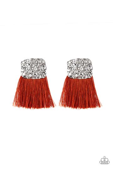 A plume of shiny orange thread streams from the bottom of a hammered silver frame, creating a bold tasseled look. Earring attaches to a standard post fitting.