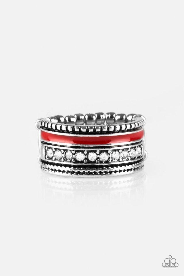 A shiny red strip of color runs along the bottom of a row of glassy white rhinestones. Infused with silver textures, the mismatched details coalesce into one thick band across the finger. Features a stretchy band for a flexible fit.