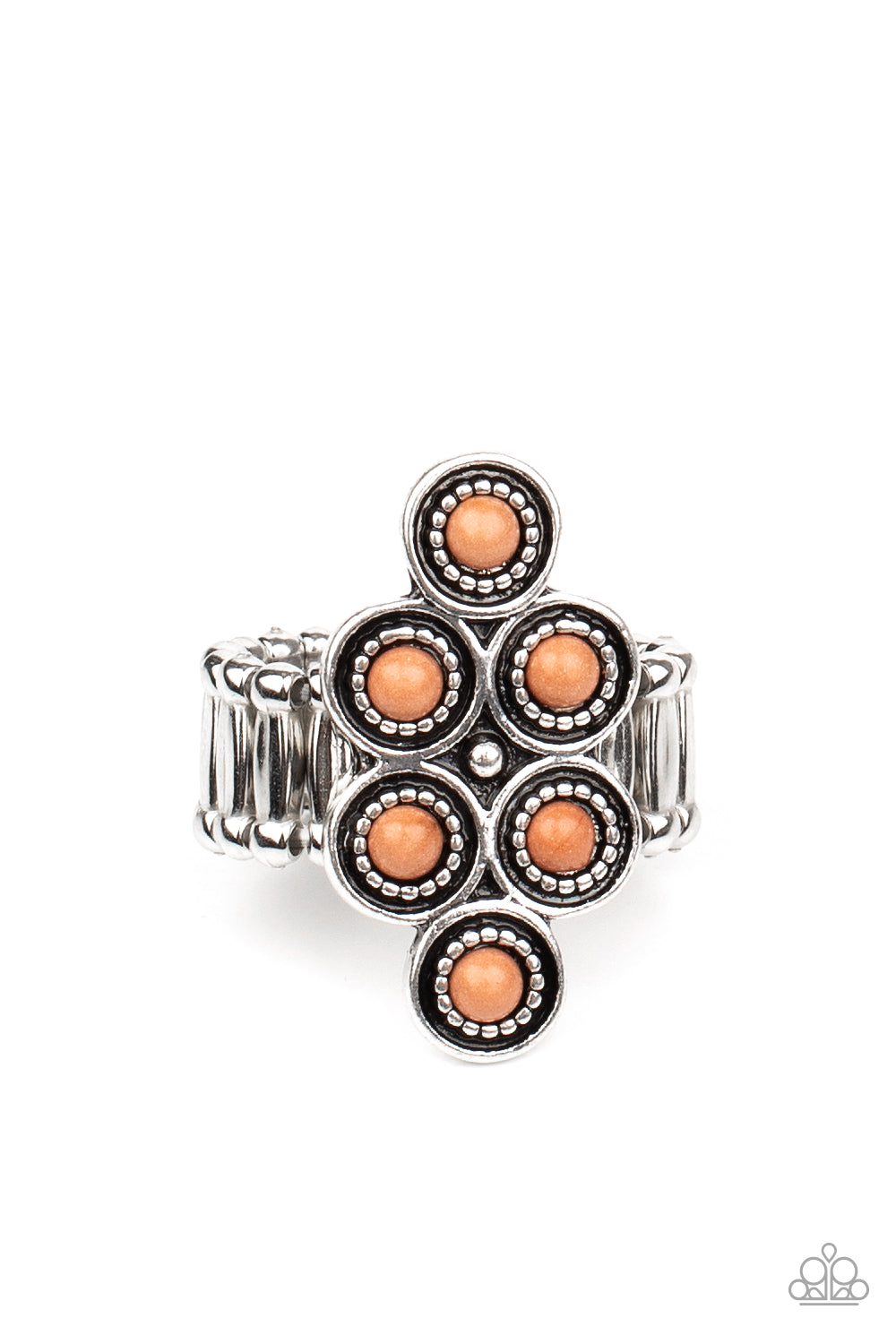 Dainty brown stones are pressed into ornate silver frames, coalescing into an earthy frame atop the finger. Features a stretchy band for a flexible fit.