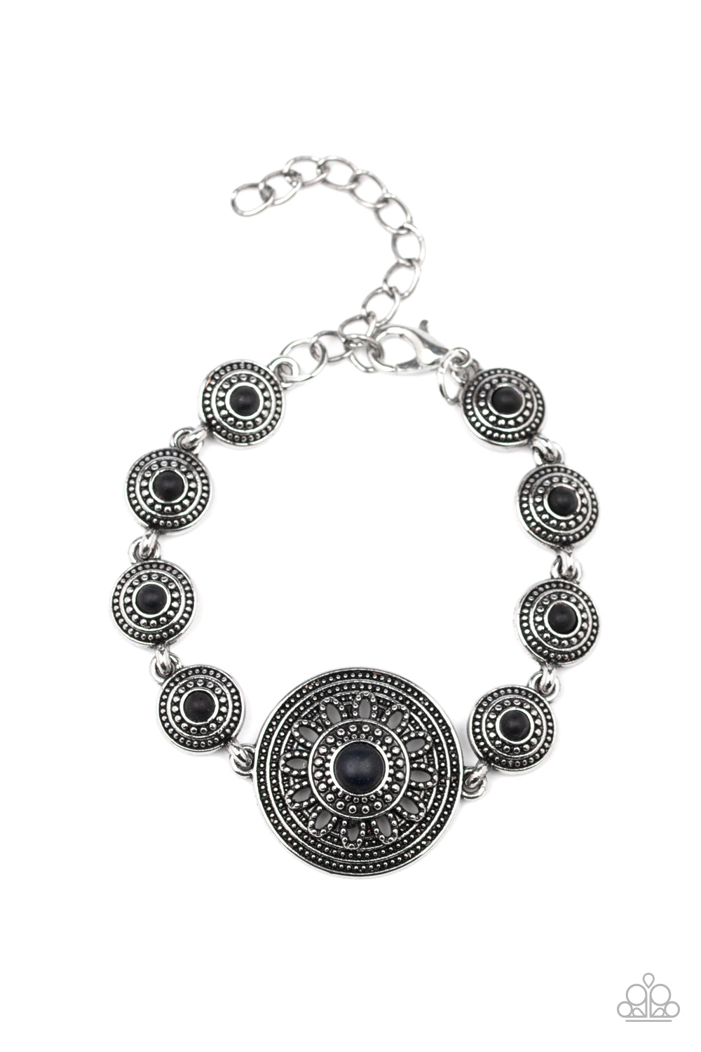 Dotted with dainty black stone centers, studded silver floral frames delicately link around the wrist for a rustic flair. Features an adjustable clasp closure.