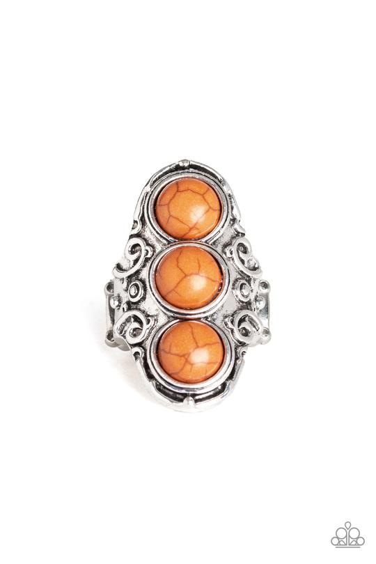 Three earthy brown stones are pressed down the center of an ornate silver frame embossed in swirling filigree for a seasonal look. Features a stretchy band for a flexible fit.