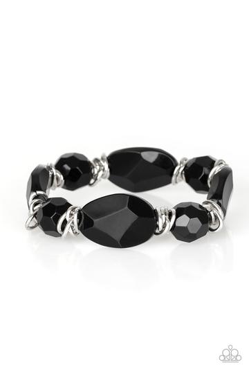 Brushed in a faux-rock finish, a collection of faceted black beads and shimmery silver links are threaded along a stretchy band around the wrist for a flavorful look.
