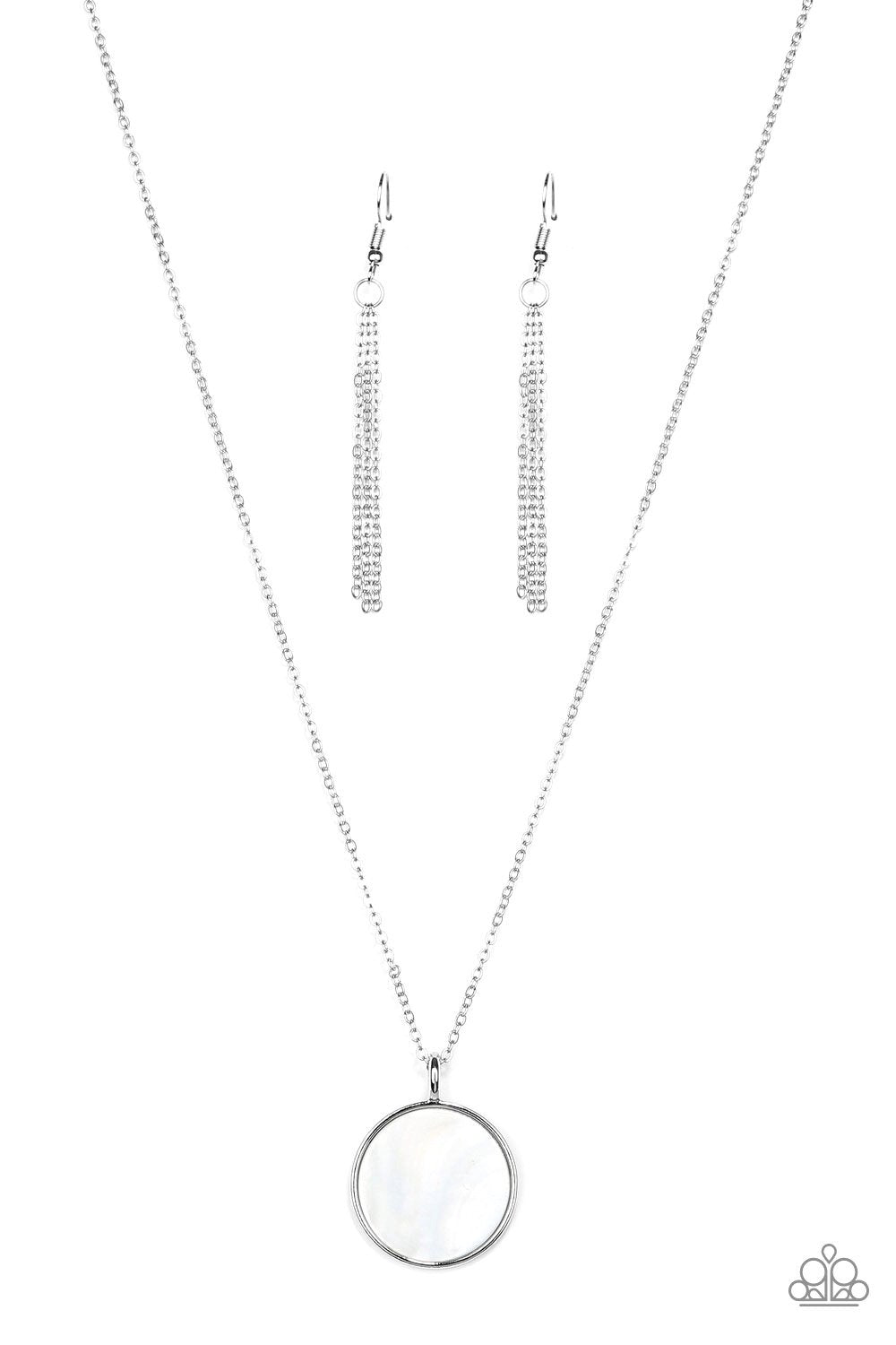 A flat shell-like pendant swings from the bottom of a dainty silver chain below the collar for a refined look. Features an adjustable clasp closure.