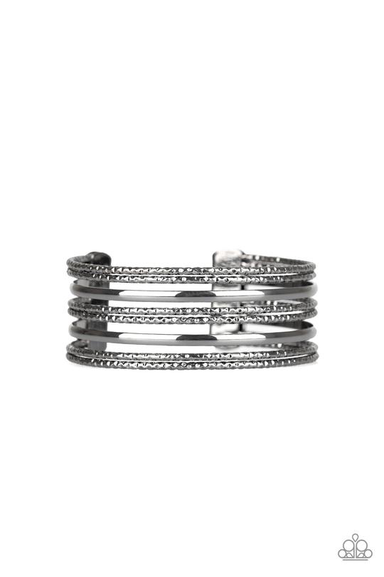 Featuring smooth and diamond-cut finishes, a variation of shimmery gunmetal bars stack across the wrist, coalescing into a casual cuff.