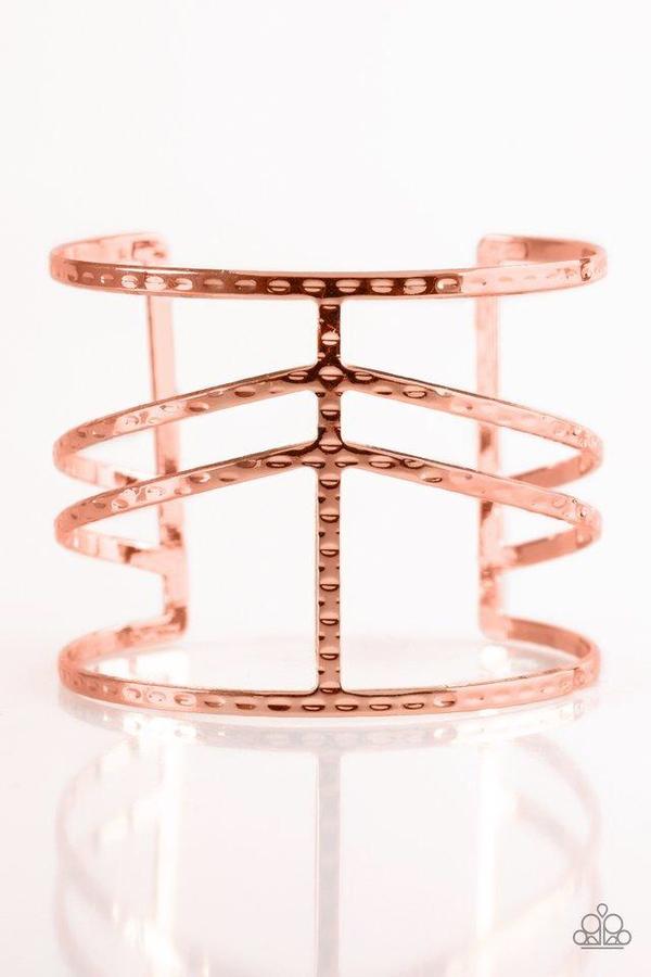 Delicately hammered in blinding shimmer, glistening copper bars crisscross across the wrist, coalescing into an airy cuff.