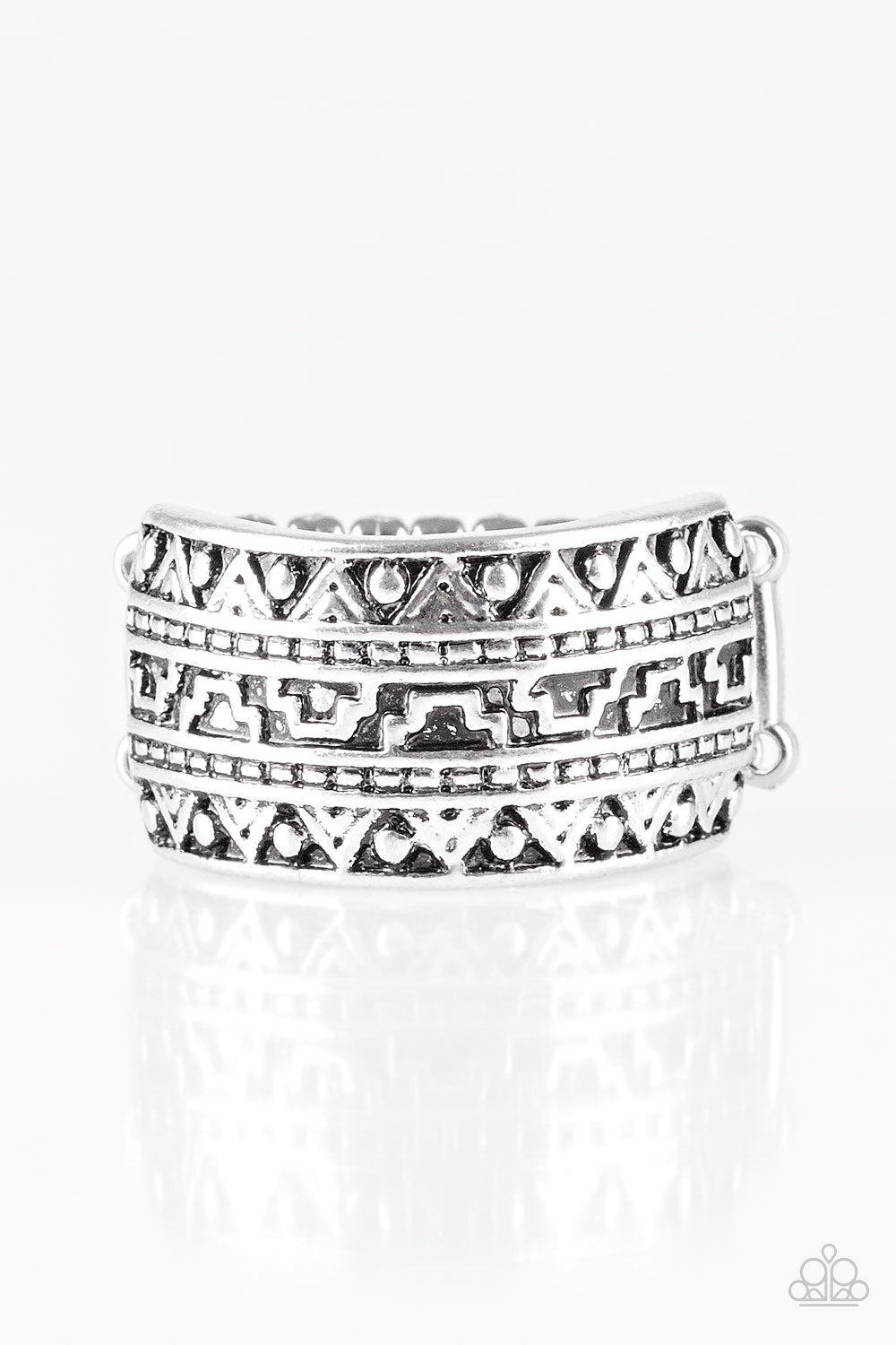 Brushed in an antiqued shimmer, a glistening silver band is embossed in stunning textile patterns for a seasonal look. Features a stretchy band for a flexible fit.