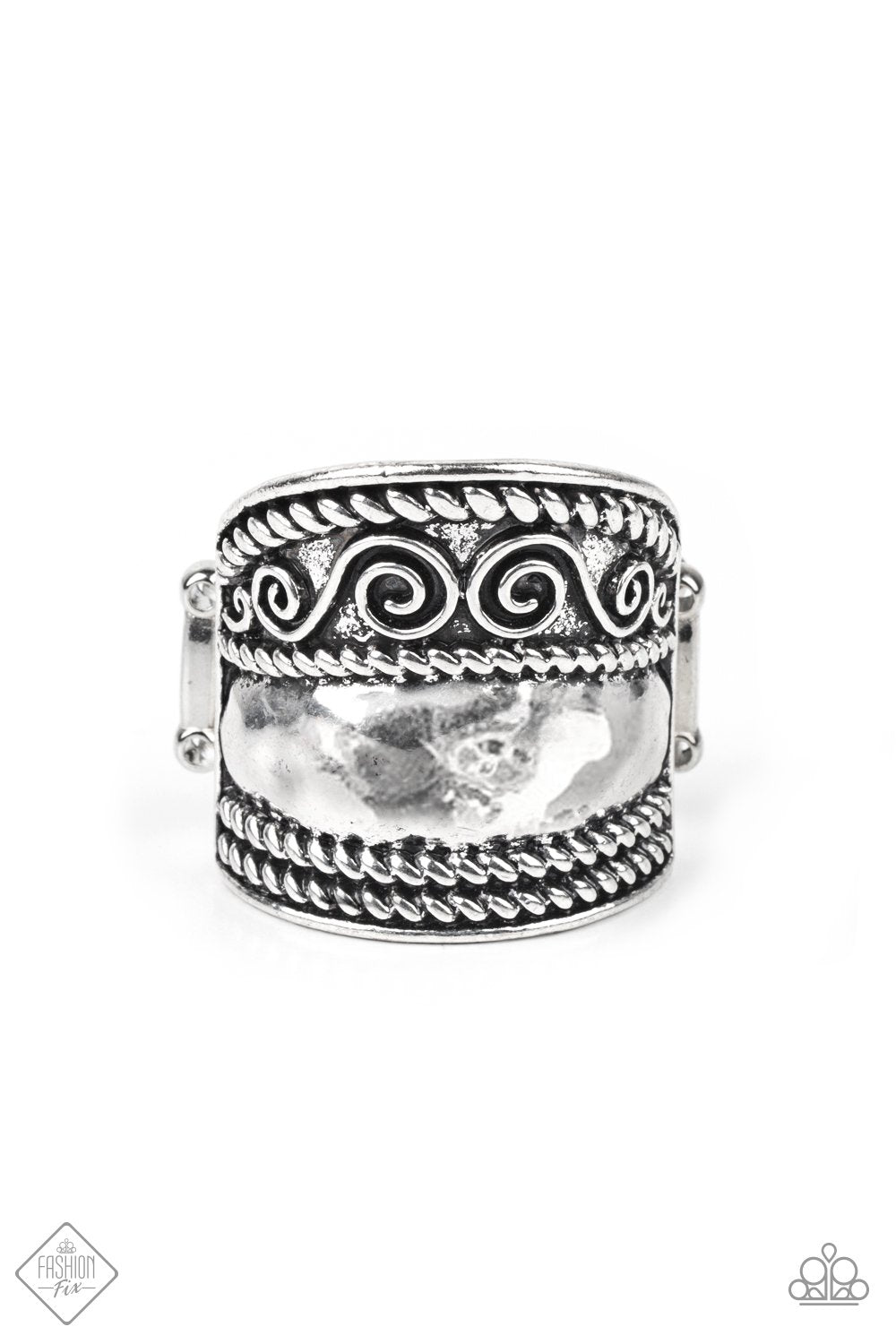 Brushed in an antiqued shimmer, rope-like textures and a swirling silver pattern border a beveled band, creating a collision of texture across the finger. Features a stretchy band for a flexible fit.