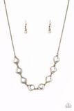 Featuring antiqued brass frames, imperfect glassy white gems link below the collar for a glamorous vintage inspired look. Features an adjustable clasp closure.