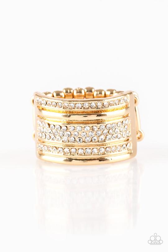Shimmery gold and white rhinestone encrusted bands stack across the finger for a glamorous look. Features a stretchy band for a flexible fit.