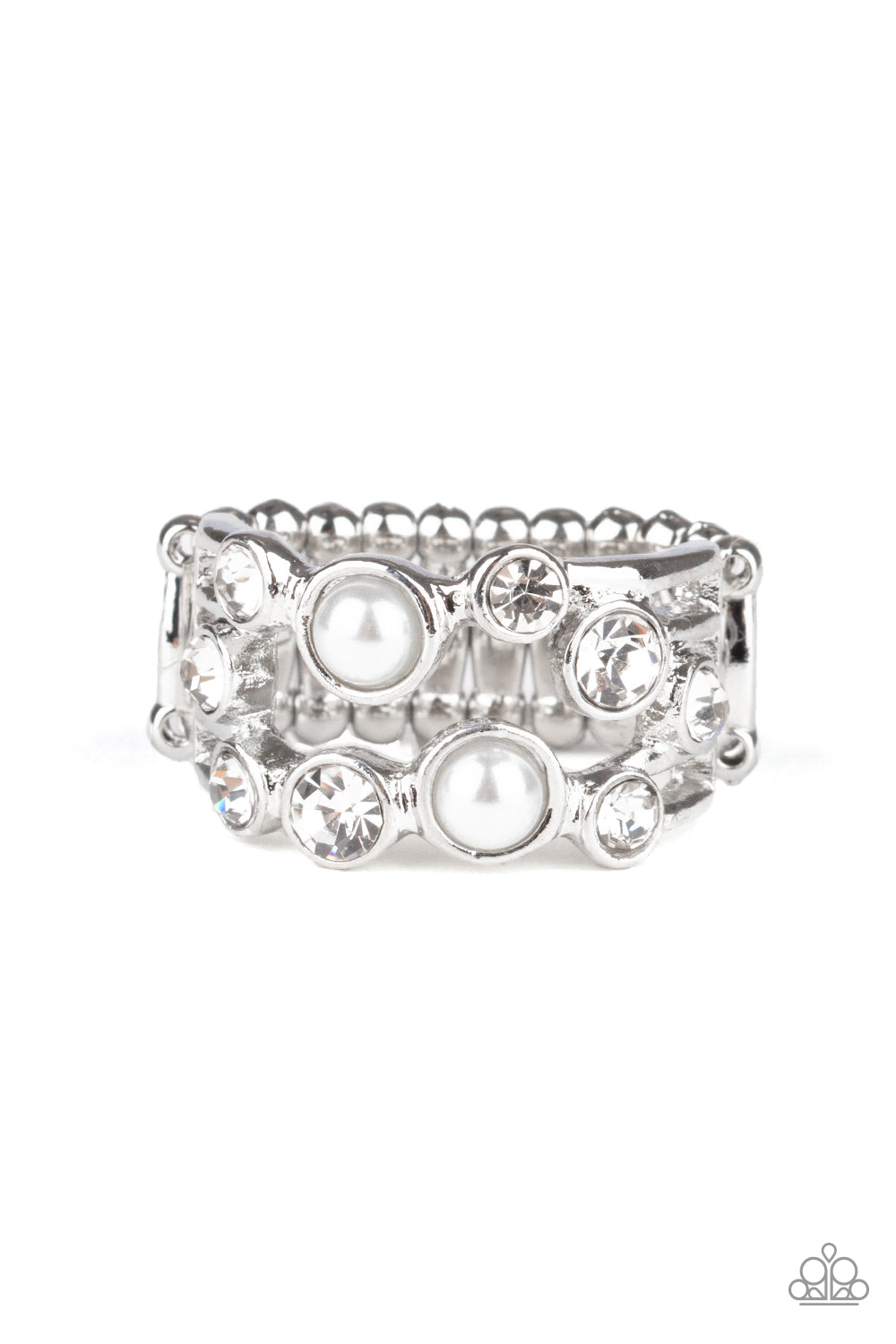 Featuring shiny silver fittings, pearly white beads and glassy white rhinestones coalesce into bubbly layers across the finger. Features a dainty stretchy band for a flexible fit.