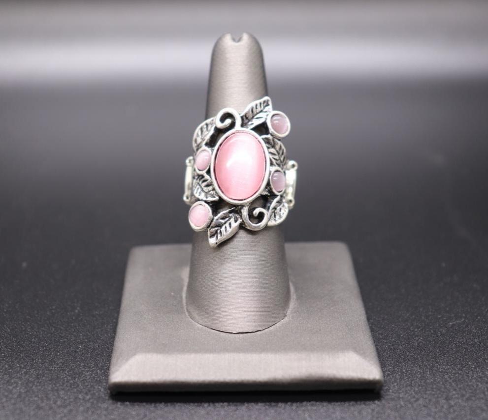 Featuring a pink moonstone center also four smaller pink moonstones surrounded by silver leaves. Features a stretchy band for a flexible fit.
